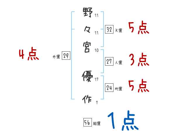 外運![]() | 野々宮優作さんの外運は29画の4つ星!完全主義で才能がある。厳格な心の持ち主。 生活面を象徴する運勢です。外部から受ける影響力を表し、結婚運、家庭運や職場、環境への順応性を表します。 |