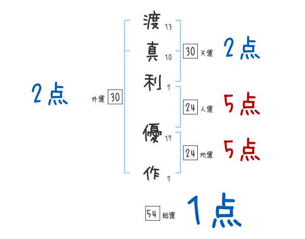 天運![]() | 渡真利優作さんの天運は30画の2つ星!浮き沈みの激しさに注意しましょう。 家系が持つ宿命的な運勢を表します。祖先から受け継いだ苗字ですので自分の力が及びません。家柄を象徴します。 |