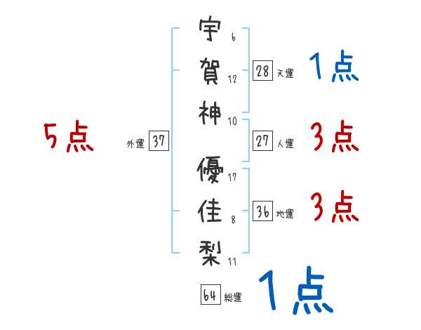 外運![]() | 宇賀神優佳梨さんの外運は37画の5つ星!努力家で順応性に優れる。現実的な考え方ができ忠実に物事をこなす。 生活面を象徴する運勢です。外部から受ける影響力を表し、結婚運、家庭運や職場、環境への順応性を表します。 |