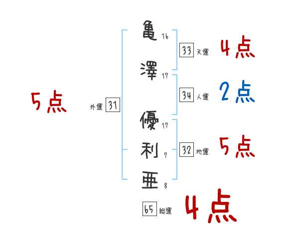 総運![]() | 亀澤優利亜さんの総運は65画の4つ星!幸運に恵まれ繁栄する。包容力がある。 あなたの人生を表す1番重要な運勢です。生涯を通じて影響する総合運となり、主に50歳以降の晩年期に影響を及ぼします。 |