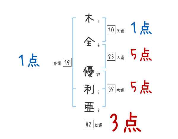 外運![]() | 木全優利亜さんの外運は19画の1つ星!優れた才能を持ちますが、協調性が足りないことも。周りの人と協力する事を意識しましょう。 生活面を象徴する運勢です。外部から受ける影響力を表し、結婚運、家庭運や職場、環境への順応性を表します。 |