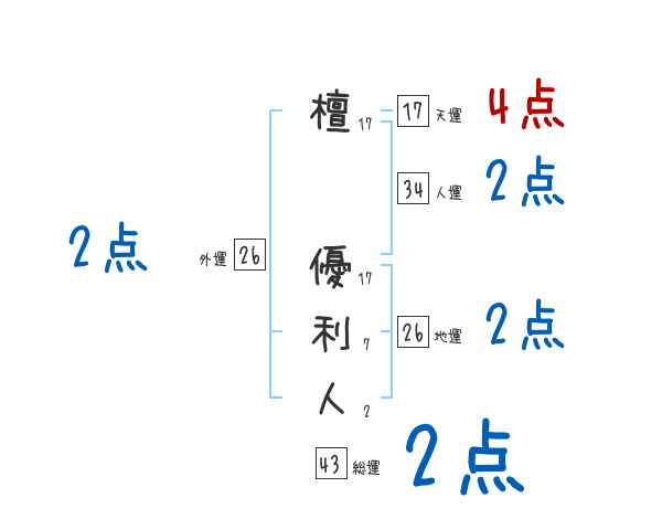 外運![]() | 檀優利人さんの外運は26画の2つ星!波瀾万丈かも。信頼できる人を大事にしましょう。 生活面を象徴する運勢です。外部から受ける影響力を表し、結婚運、家庭運や職場、環境への順応性を表します。 |