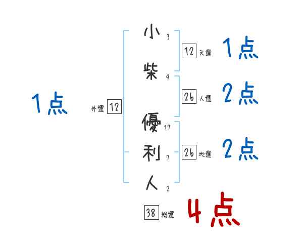 天運![]() | 小柴優利人さんの天運は12画の1つ星!簡単な失敗で諦めてしまいやすいかも。着実に行動すると良いでしょう。 家系が持つ宿命的な運勢を表します。祖先から受け継いだ苗字ですので自分の力が及びません。家柄を象徴します。 |