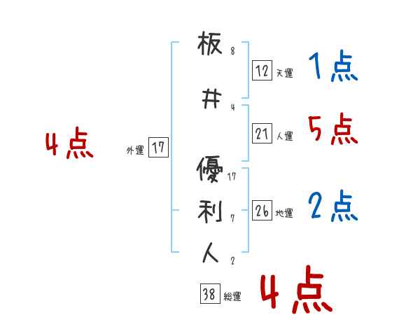 外運![]() | 板井優利人さんの外運は17画の4つ星!積極的な行動力。地位を気づき財産を手に入れる。純粋な心と直感力。 生活面を象徴する運勢です。外部から受ける影響力を表し、結婚運、家庭運や職場、環境への順応性を表します。 |