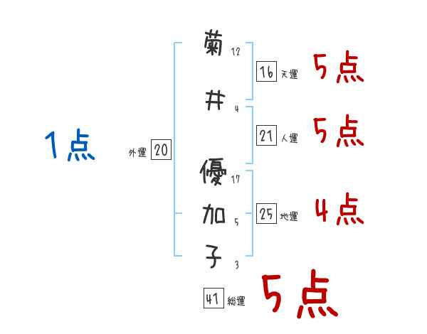 天運![]() | 菊井優加子さんの天運は16画の5つ星!人望が厚く大きく発展する。逆転成功が見える。 家系が持つ宿命的な運勢を表します。祖先から受け継いだ苗字ですので自分の力が及びません。家柄を象徴します。 |