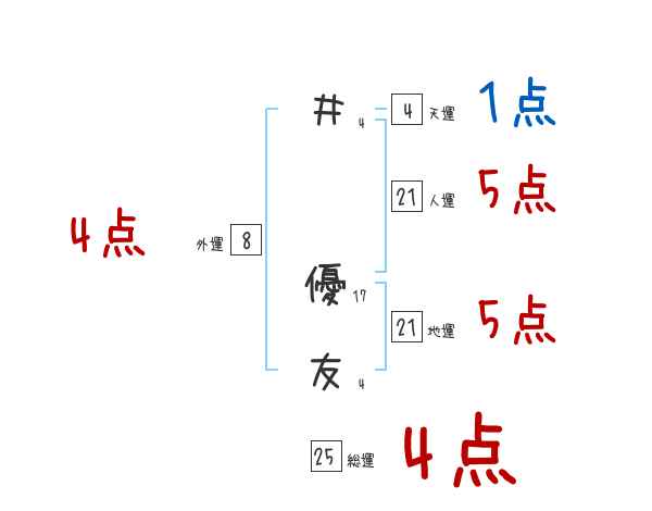 人運![]() | 井優友さんの人運は21画の5つ星!統率力がある。独立し成功する。名誉を手に入れる。 性格や才能などを表す2番目に重要な運勢です。人間関係や協調性、社会的な成功に影響します。主に20歳から50歳ぐらいまでの中年期の運勢を表します。 |