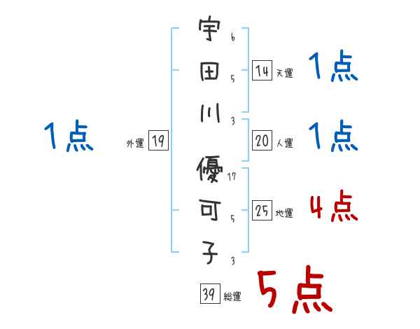 総運![]() | 宇田川優可子さんの総運は39画の5つ星!社交性に優れ人望が厚い。人の上に立ち成功する。 あなたの人生を表す1番重要な運勢です。生涯を通じて影響する総合運となり、主に50歳以降の晩年期に影響を及ぼします。 |