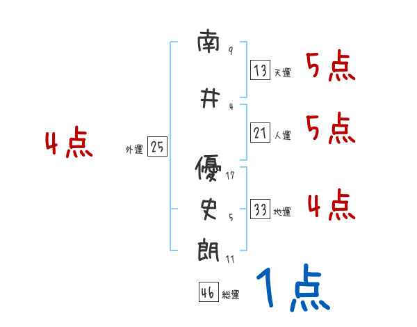 総運![]() | 南井優史朗さんの総運は46画の1つ星!迷走することが多く苦労するかも。目先のことにとらわれないように。 あなたの人生を表す1番重要な運勢です。生涯を通じて影響する総合運となり、主に50歳以降の晩年期に影響を及ぼします。 |