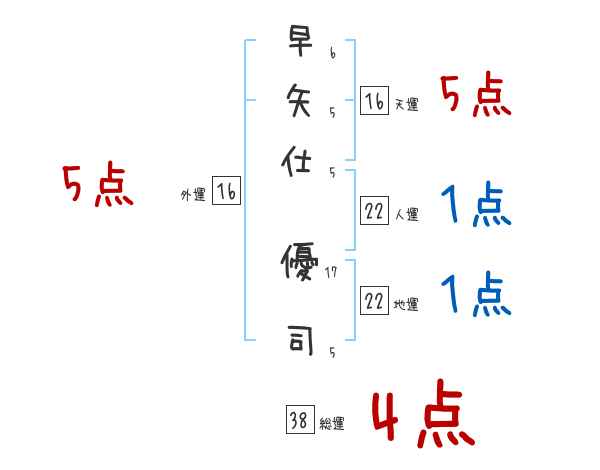 外運![]() | 早矢仕優司さんの外運は16画の5つ星!人望が厚く大きく発展する。逆転成功が見える。 生活面を象徴する運勢です。外部から受ける影響力を表し、結婚運、家庭運や職場、環境への順応性を表します。 |