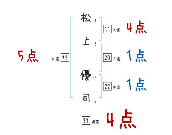 天運![]() | 松上優司さんの天運は11画の4つ星!着実に富や地位を得る幸運な人生。 家系が持つ宿命的な運勢を表します。祖先から受け継いだ苗字ですので自分の力が及びません。家柄を象徴します。 |