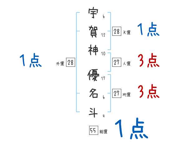 外運![]() | 宇賀神優名斗さんの外運は28画の1つ星!家庭環境に注意。スポーツで活躍できる能力があるかも。 生活面を象徴する運勢です。外部から受ける影響力を表し、結婚運、家庭運や職場、環境への順応性を表します。 |