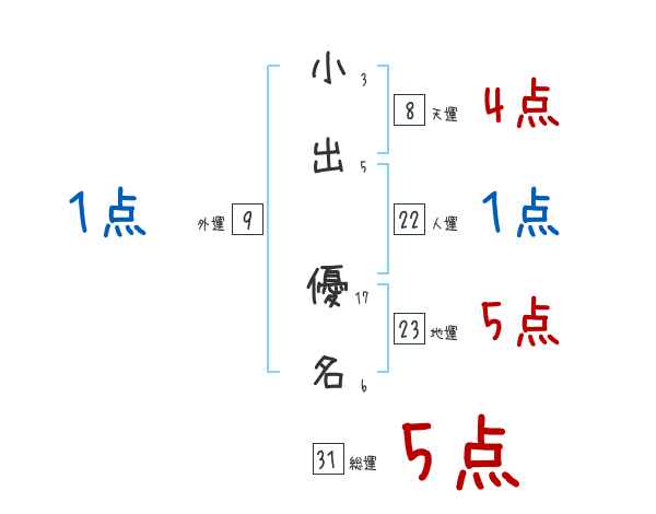 総運![]() | 小出優名さんの総運は31画の5つ星!社交性があり判断力に優れる。順風満帆な人生で円満な生活。 あなたの人生を表す1番重要な運勢です。生涯を通じて影響する総合運となり、主に50歳以降の晩年期に影響を及ぼします。 |