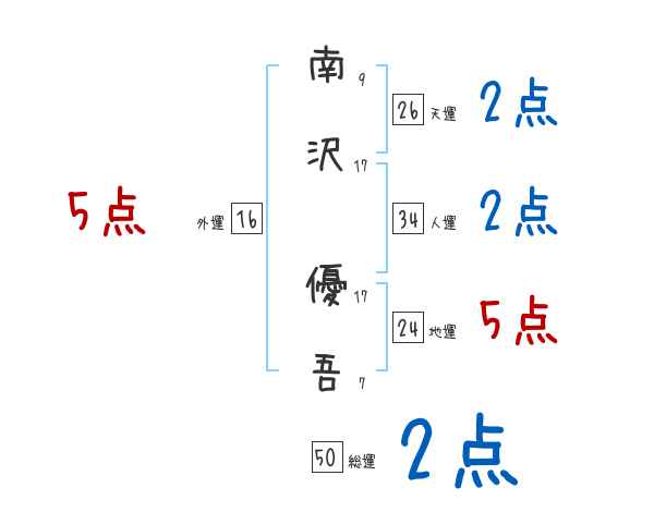 総運![]() | 南沢優吾さんの総運は50画の2つ星!浮き沈みが激しく不安定。しりすぼみに衰退しやすいので注意しましょう。 あなたの人生を表す1番重要な運勢です。生涯を通じて影響する総合運となり、主に50歳以降の晩年期に影響を及ぼします。 |