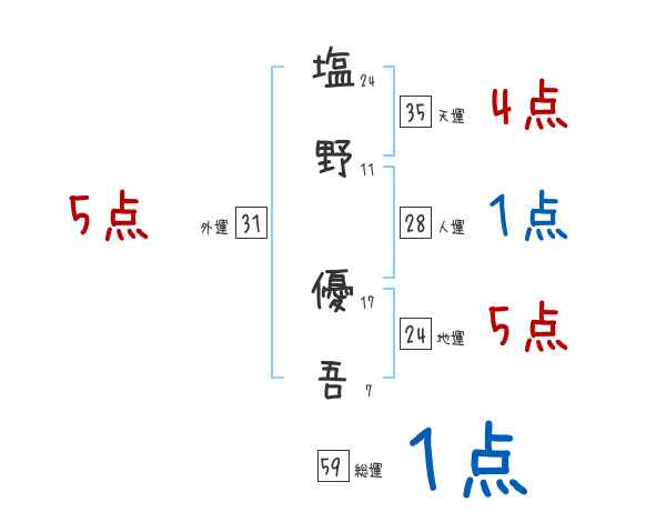 天運![]() | 塩野優吾さんの天運は35画の4つ星!温厚な性格で感受性が高い。穏和な性格で人望が厚い。 家系が持つ宿命的な運勢を表します。祖先から受け継いだ苗字ですので自分の力が及びません。家柄を象徴します。 |