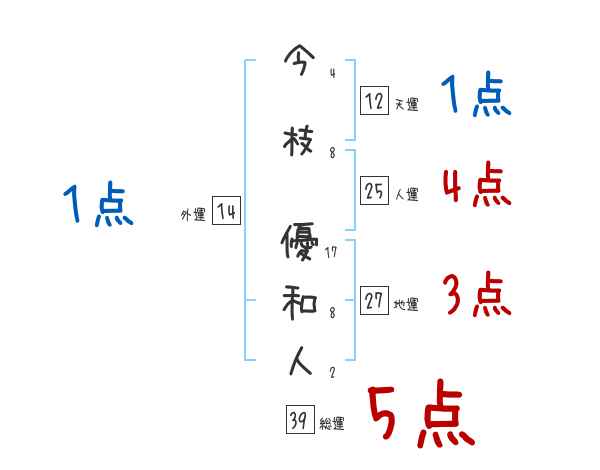 外運![]() | 今枝優和人さんの外運は14画の1つ星!人に対して優しいがストレスを溜め込みがち。人間関係のトラブルを避けるよう気をつけましょう。 生活面を象徴する運勢です。外部から受ける影響力を表し、結婚運、家庭運や職場、環境への順応性を表します。 |