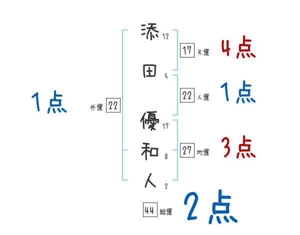 人運![]() | 添田優和人さんの人運は22画の1つ星!努力することが苦手ないっぽう手先が器用。芸術性にも優れる。 性格や才能などを表す2番目に重要な運勢です。人間関係や協調性、社会的な成功に影響します。主に20歳から50歳ぐらいまでの中年期の運勢を表します。 |