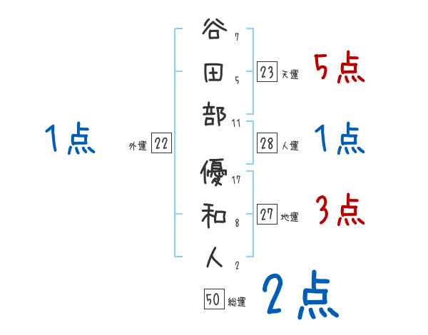人運![]() | 谷田部優和人さんの人運は28画の1つ星!家庭環境に注意。スポーツで活躍できる能力があるかも。 性格や才能などを表す2番目に重要な運勢です。人間関係や協調性、社会的な成功に影響します。主に20歳から50歳ぐらいまでの中年期の運勢を表します。 |