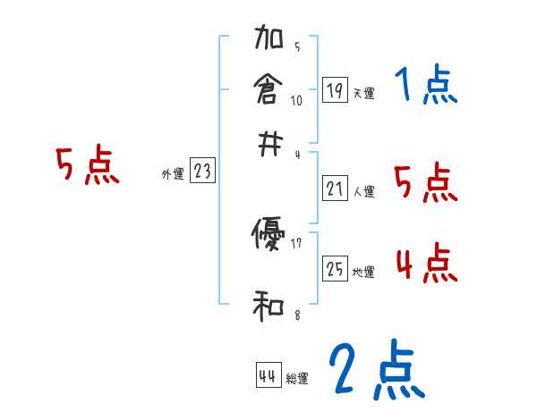 総運![]() | 加倉井優和さんの総運は44画の2つ星!誠実で慎重な性格。物事を考えすぎないように注意しましょう。 あなたの人生を表す1番重要な運勢です。生涯を通じて影響する総合運となり、主に50歳以降の晩年期に影響を及ぼします。 |