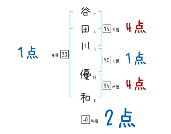 外運![]() | 谷田川優和さんの外運は20画の1つ星!社交が苦手。人とは違った才能があり波乱万丈な人生かも。 生活面を象徴する運勢です。外部から受ける影響力を表し、結婚運、家庭運や職場、環境への順応性を表します。 |