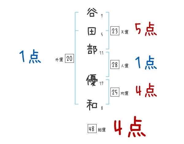 総運![]() | 谷田部優和さんの総運は48画の4つ星!賢明な性格で人望が厚い。指導力があり多くの人に尊敬される。 あなたの人生を表す1番重要な運勢です。生涯を通じて影響する総合運となり、主に50歳以降の晩年期に影響を及ぼします。 |