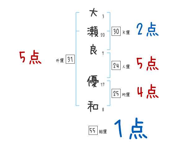 外運![]() | 大瀬良優和さんの外運は31画の5つ星!社交性があり判断力に優れる。順風満帆な人生で円満な生活。 生活面を象徴する運勢です。外部から受ける影響力を表し、結婚運、家庭運や職場、環境への順応性を表します。 |