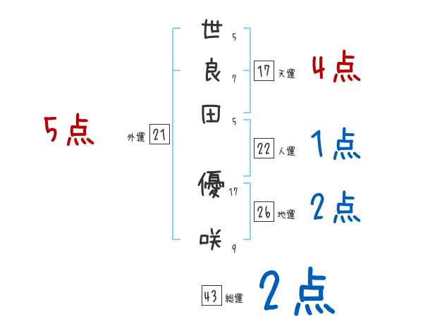 外運![]() | 世良田優咲さんの外運は21画の5つ星!統率力がある。独立し成功する。名誉を手に入れる。 生活面を象徴する運勢です。外部から受ける影響力を表し、結婚運、家庭運や職場、環境への順応性を表します。 |