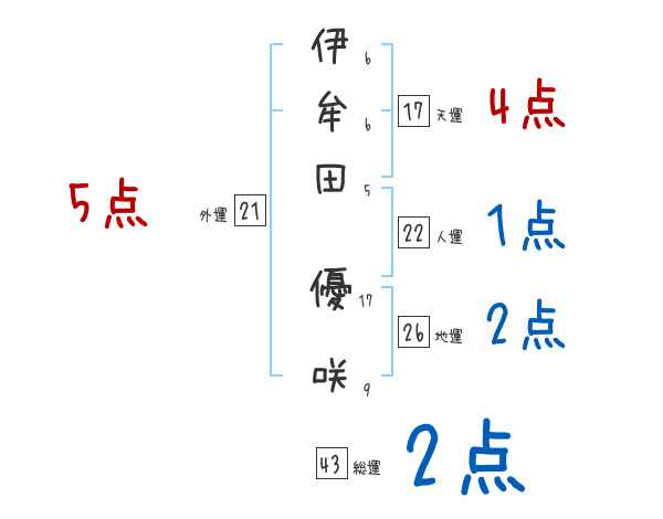 外運![]() | 伊牟田優咲さんの外運は21画の5つ星!統率力がある。独立し成功する。名誉を手に入れる。 生活面を象徴する運勢です。外部から受ける影響力を表し、結婚運、家庭運や職場、環境への順応性を表します。 |