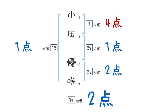 総運![]() | 小田優咲さんの総運は34画の2つ星!独創性に優れるが、自尊心が強く災難に注意しましょう。 あなたの人生を表す1番重要な運勢です。生涯を通じて影響する総合運となり、主に50歳以降の晩年期に影響を及ぼします。 |
