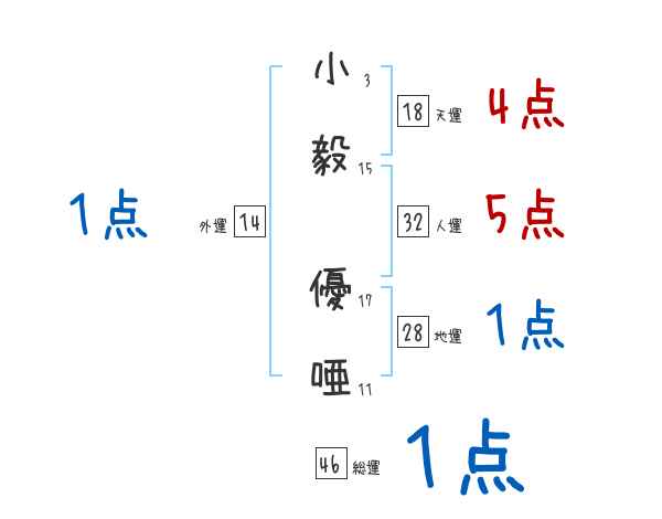 外運![]() | 小毅優唖さんの外運は14画の1つ星!人に対して優しいがストレスを溜め込みがち。人間関係のトラブルを避けるよう気をつけましょう。 生活面を象徴する運勢です。外部から受ける影響力を表し、結婚運、家庭運や職場、環境への順応性を表します。 |