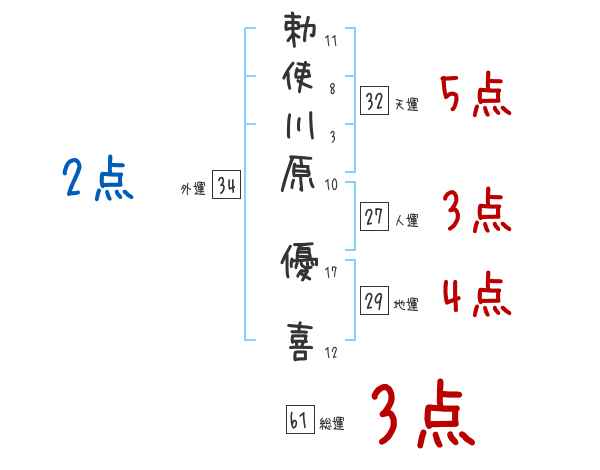 天運![]() | 勅使川原優喜さんの天運は32画の5つ星!柔軟性があり成功する。チャンスが多く金運が良い。 家系が持つ宿命的な運勢を表します。祖先から受け継いだ苗字ですので自分の力が及びません。家柄を象徴します。 |