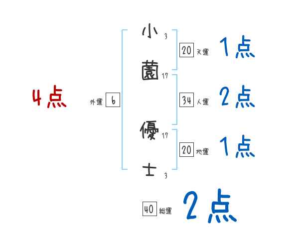 外運![]() | 小薗優士さんの外運は6画の4つ星!慎重な努力家で信頼を得る。誠実な精神で向上心に優れる。 生活面を象徴する運勢です。外部から受ける影響力を表し、結婚運、家庭運や職場、環境への順応性を表します。 |