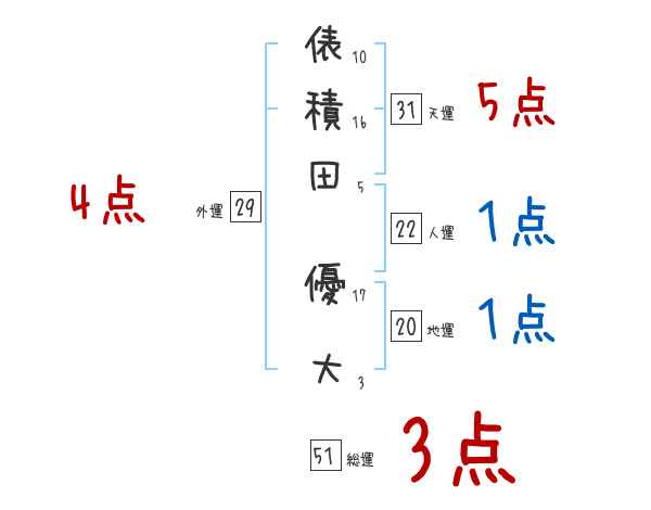 人運![]() | 俵積田優大さんの人運は22画の1つ星!努力することが苦手ないっぽう手先が器用。芸術性にも優れる。 性格や才能などを表す2番目に重要な運勢です。人間関係や協調性、社会的な成功に影響します。主に20歳から50歳ぐらいまでの中年期の運勢を表します。 |