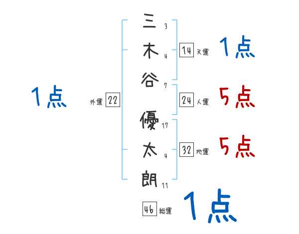 外運![]() | 三木谷優太朗さんの外運は22画の1つ星!努力することが苦手ないっぽう手先が器用。芸術性にも優れる。 生活面を象徴する運勢です。外部から受ける影響力を表し、結婚運、家庭運や職場、環境への順応性を表します。 |