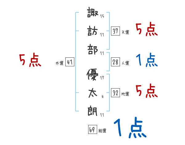総運![]() | 諏訪部優太朗さんの総運は69画の1つ星!不満を感じやすい傾向が。ストレスを貯めないように注意しましょう。 あなたの人生を表す1番重要な運勢です。生涯を通じて影響する総合運となり、主に50歳以降の晩年期に影響を及ぼします。 |