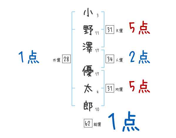 天運![]() | 小野澤優太郎さんの天運は31画の5つ星!社交性があり判断力に優れる。順風満帆な人生で円満な生活。 家系が持つ宿命的な運勢を表します。祖先から受け継いだ苗字ですので自分の力が及びません。家柄を象徴します。 |