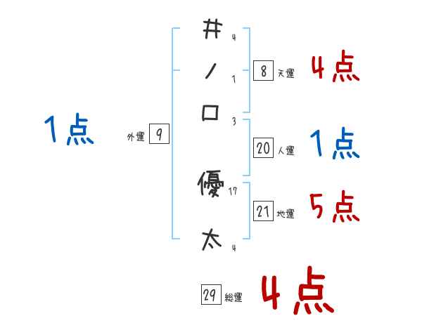 総運![]() | 井ノ口優太さんの総運は29画の4つ星!完全主義で才能がある。厳格な心の持ち主。 あなたの人生を表す1番重要な運勢です。生涯を通じて影響する総合運となり、主に50歳以降の晩年期に影響を及ぼします。 |