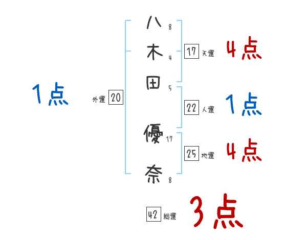 総運![]() | 八木田優奈さんの総運は42画の3つ星!病気に注意。多芸であるが消極的でおとなしい。 あなたの人生を表す1番重要な運勢です。生涯を通じて影響する総合運となり、主に50歳以降の晩年期に影響を及ぼします。 |