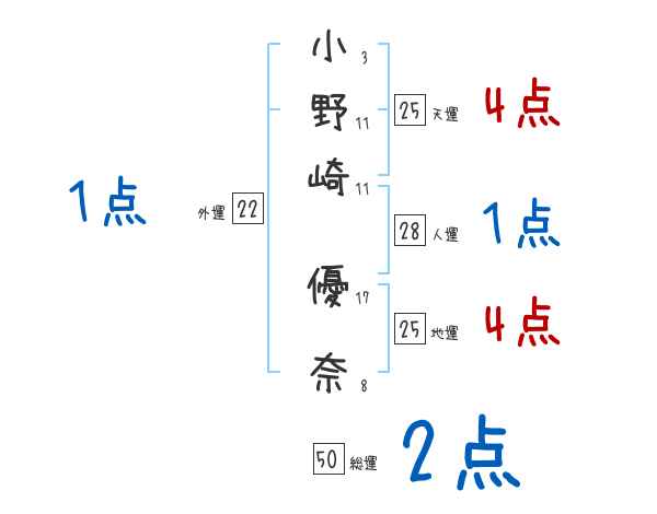 天運![]() | 小野崎優奈さんの天運は25画の4つ星!個性があり才能があふれる。強運の持ち主で発展する。 家系が持つ宿命的な運勢を表します。祖先から受け継いだ苗字ですので自分の力が及びません。家柄を象徴します。 |