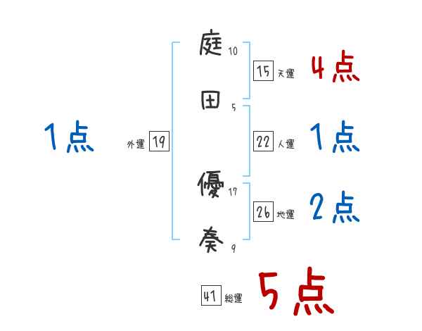 外運![]() | 庭田優奏さんの外運は19画の1つ星!優れた才能を持ちますが、協調性が足りないことも。周りの人と協力する事を意識しましょう。 生活面を象徴する運勢です。外部から受ける影響力を表し、結婚運、家庭運や職場、環境への順応性を表します。 |