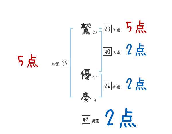 天運![]() | 鷲優奏さんの天運は23画の5つ星!想像力に優れ活力がある。一代で成功し名誉を手に入れる。 家系が持つ宿命的な運勢を表します。祖先から受け継いだ苗字ですので自分の力が及びません。家柄を象徴します。 |