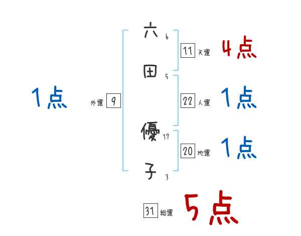 天運![]() | 六田優子さんの天運は11画の4つ星!着実に富や地位を得る幸運な人生。 家系が持つ宿命的な運勢を表します。祖先から受け継いだ苗字ですので自分の力が及びません。家柄を象徴します。 |