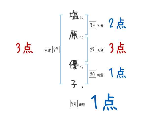 外運![]() | 塩原優子さんの外運は27画の3つ星!頭脳明晰だが強情で摩擦が多い傾向。孤立に注意。 生活面を象徴する運勢です。外部から受ける影響力を表し、結婚運、家庭運や職場、環境への順応性を表します。 |