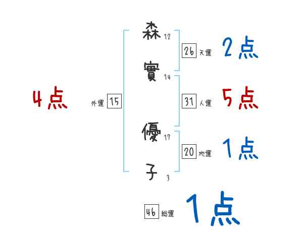 総運![]() | 森實優子さんの総運は46画の1つ星!迷走することが多く苦労するかも。目先のことにとらわれないように。 あなたの人生を表す1番重要な運勢です。生涯を通じて影響する総合運となり、主に50歳以降の晩年期に影響を及ぼします。 |