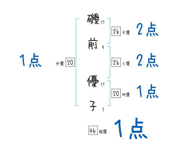 天運![]() | 磯前優子さんの天運は26画の2つ星!波瀾万丈かも。信頼できる人を大事にしましょう。 家系が持つ宿命的な運勢を表します。祖先から受け継いだ苗字ですので自分の力が及びません。家柄を象徴します。 |