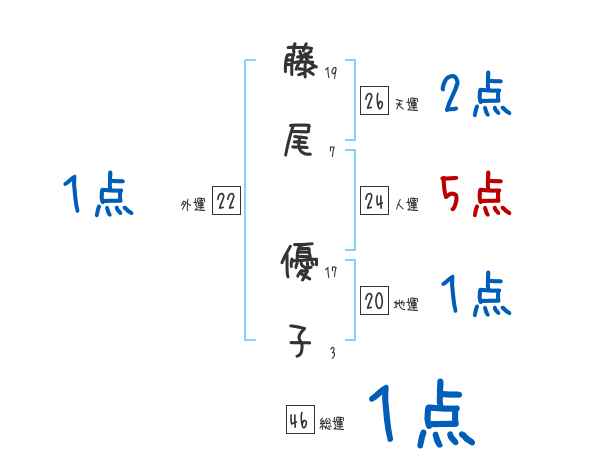 総運![]() | 藤尾優子さんの総運は46画の1つ星!迷走することが多く苦労するかも。目先のことにとらわれないように。 あなたの人生を表す1番重要な運勢です。生涯を通じて影響する総合運となり、主に50歳以降の晩年期に影響を及ぼします。 |