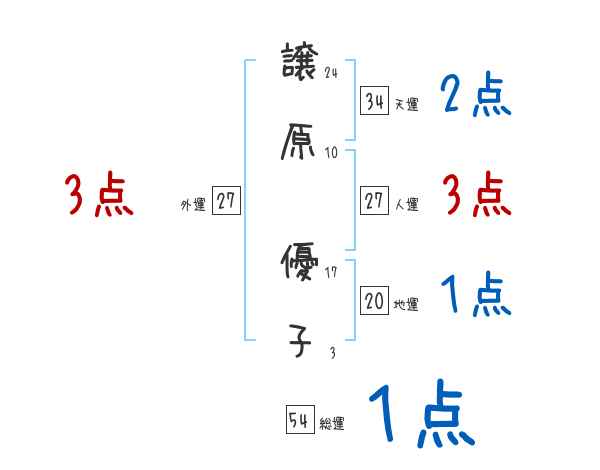 天運![]() | 譲原優子さんの天運は34画の2つ星!独創性に優れるが、自尊心が強く災難に注意しましょう。 家系が持つ宿命的な運勢を表します。祖先から受け継いだ苗字ですので自分の力が及びません。家柄を象徴します。 |