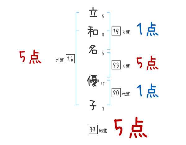 外運![]() | 立和名優子さんの外運は16画の5つ星!人望が厚く大きく発展する。逆転成功が見える。 生活面を象徴する運勢です。外部から受ける影響力を表し、結婚運、家庭運や職場、環境への順応性を表します。 |