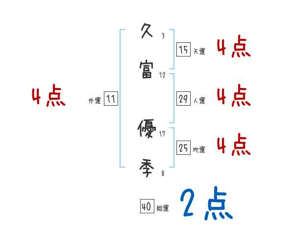 人運![]() | 久富優季さんの人運は29画の4つ星!完全主義で才能がある。厳格な心の持ち主。 性格や才能などを表す2番目に重要な運勢です。人間関係や協調性、社会的な成功に影響します。主に20歳から50歳ぐらいまでの中年期の運勢を表します。 |