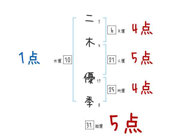 人運![]() | 二木優季さんの人運は21画の5つ星!統率力がある。独立し成功する。名誉を手に入れる。 性格や才能などを表す2番目に重要な運勢です。人間関係や協調性、社会的な成功に影響します。主に20歳から50歳ぐらいまでの中年期の運勢を表します。 |