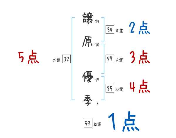 天運![]() | 譲原優季さんの天運は34画の2つ星!独創性に優れるが、自尊心が強く災難に注意しましょう。 家系が持つ宿命的な運勢を表します。祖先から受け継いだ苗字ですので自分の力が及びません。家柄を象徴します。 |